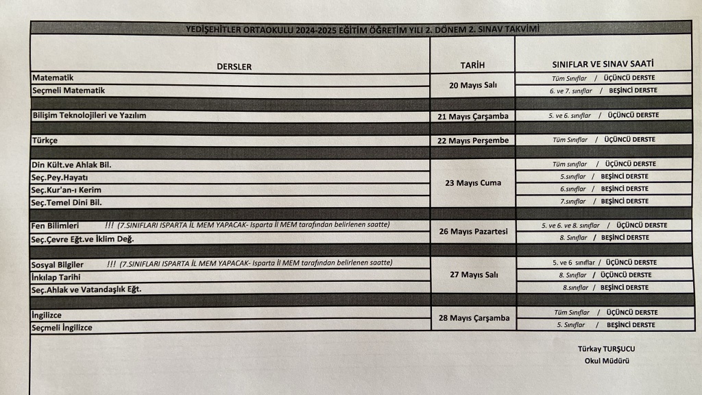 2024-2025 eğitim-öğretim yılı 2. dönem 2. yazılı sınav takvimi, tabloda belirtilen şekilde belirlenmiştir.